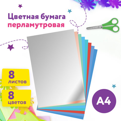 Цветная бумага А4 МЕЛОВАННАЯ ПЕРЛАМУТРОВАЯ, 8 листов 8 цветов, в папке, ЮНЛАНДИЯ, 200х290 мм, "ПОПУГАЙ", 111325