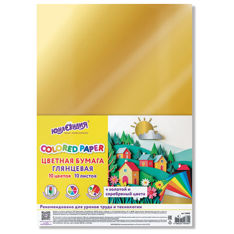 Цветная бумага А4 мелованная ВОЛШЕБНАЯ, 10 листов, 10 цветов, 200х280 мм, ЮНЛАНДИЯ "ДОМИКИ", 116959
