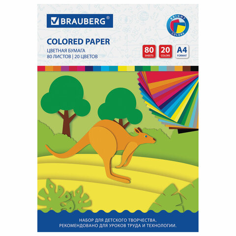 Цветная бумага А4 офсетная, 80 листов, 20 цветов, в папке, BRAUBERG, 200х290 мм, "Кенгуру", 113539