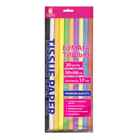 Цветная бумага ТИШЬЮ 17 г/м2, 50х66 см, 20 листов, 10 цветов, пастель ассорти, ЗОЛОТАЯ СКАЗКА, 116493