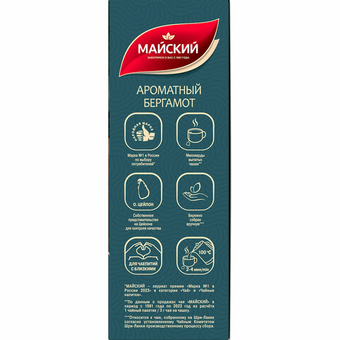 Чай МАЙСКИЙ "Ароматный бергамот" черный цейлонский байховый, 100 пакетиков по 1,5 г, 102627