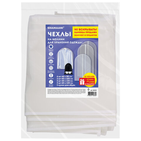 Чехлы для хранения одежды на молнии, КОМПЛЕКТ 12 шт. + 1 чехол + 2 сумки для обуви в подарок, SHAMAANI (ШАМААНИ), 609595