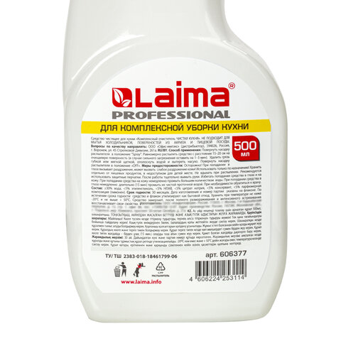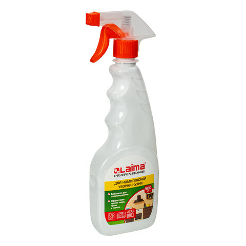 Средство для комплексной уборки кухни LAIMA PROFESSIONAL эффективно для мытья и чистки плит, моек, кранов, наружных поверхностей, воздухоочистителей, кухонной мебели из дерева, полимерных материалов и металлических изделий.