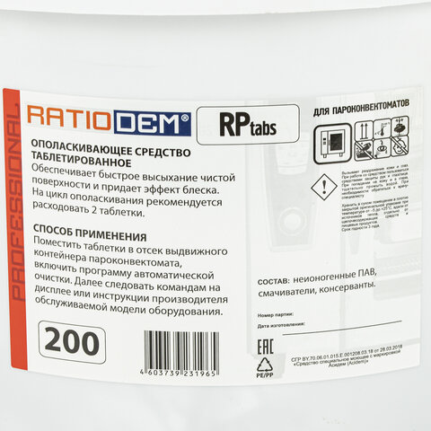 Таблетки для пароконвектоматов ополаскивающие 200 шт., RatioDem RP, ведерко