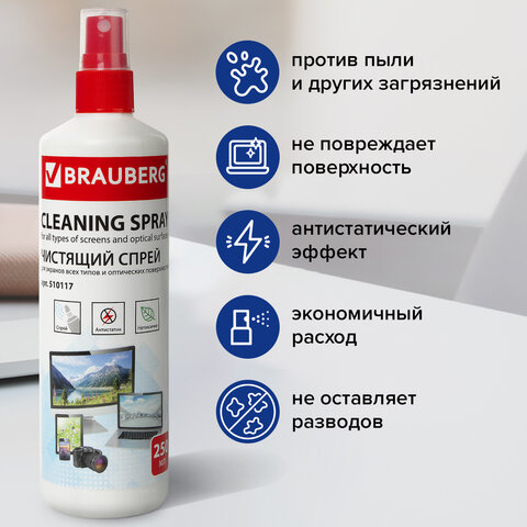 Чистящая жидкость-спрей BRAUBERG для экранов всех типов и оптики, универсальная, 250 мл, 510117