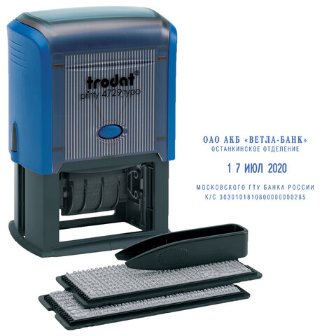 Датер самонаборный, месяц БУКВАМИ, 4 строки + дата, оттиск 50х30 мм, синий, TRODAT 4729 P3, КАССЫ, 53334