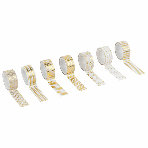 Клейкие WASHI-ленты для декора с фольгой ЗОЛОТИСТЫЕ, 15 мм х 3 м, 7 шт., рисовая бумага, ОСТРОВ СОКРОВИЩ, 661712