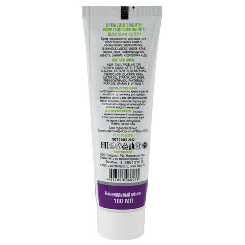 Крем защитный, 100 мл, ЭЛЕН, гидрофильный, от масел, красок, смазок, извести, цемента