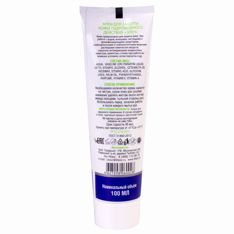 Крем защитный, 100 мл, ЭЛЕН, гидрофобный, от кислотных и щелочных средств, смазочно-охлаждающих жидкостей