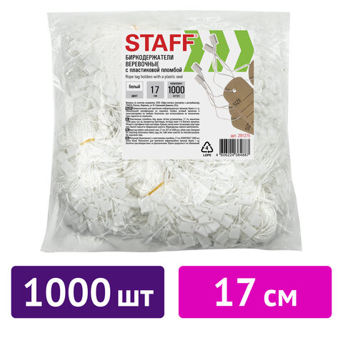 Биркодержатели веревочные с пластиковой пломбой 17 см, STAFF, КОМПЛЕКТ 1000 штук, белые, 291275
