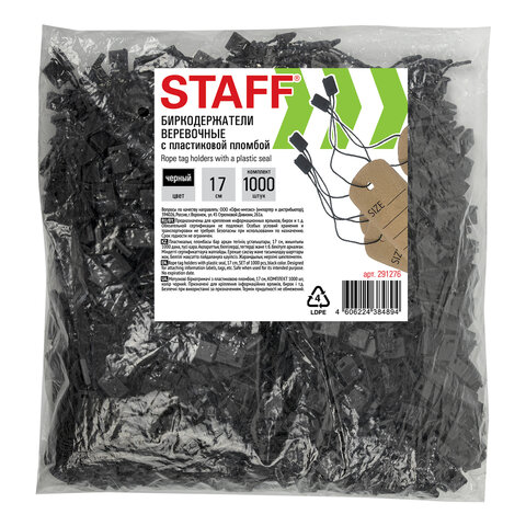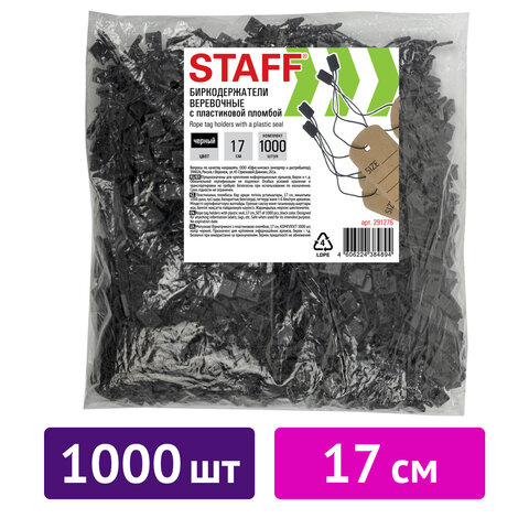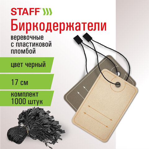 Биркодержатели веревочные с пластиковой пломбой 17 см, STAFF, КОМПЛЕКТ 1000 штук, черные, 291276