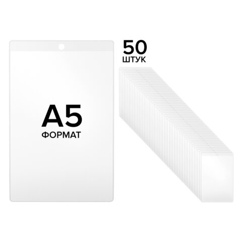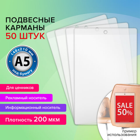 Карман информационный подвесной, ценникодержатель А5, КОМПЛЕКТ 50 шт., ПВХ, BRAUBERG, 291285