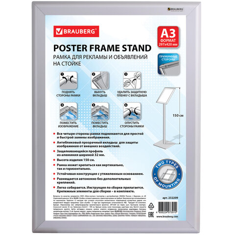 Рамка на стойке для рекламы БОЛЬШОГО ФОРМАТА (297х420 мм), А3, алюминиевая, прижимные стороны, BRAUBERG, 232209