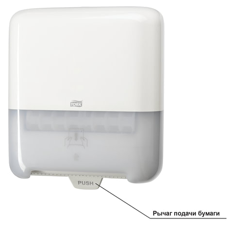 Бесконтактный диспенсер оптимально подходит для мест с высокой проходимостью, обеспечивает значительное сокращение расхода полотенец. Автоматический отрыв полотенец листами по 25 см в длину. Рычаг подачи полотенец "PUSH" виден только при заправке рулона.