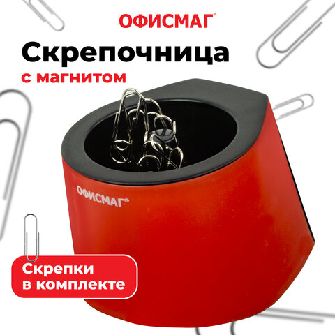 Скрепочница магнитная ОФИСМАГ с 30 скрепками, стильный корпус, красно-черная, 225192