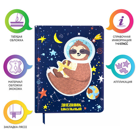Дневник 1-4 класс 48 л., кожзам (твердая), печать, аппликация, ЮНЛАНДИЯ, "Ленивец", 106197