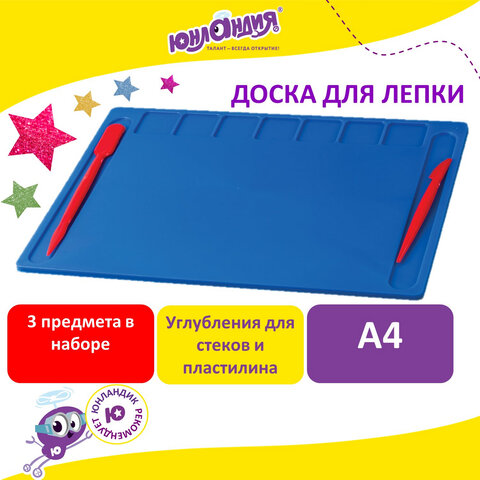 Доска для лепки А4, 280х200 мм, ЮНЛАНДИЯ, синяя, 7 отделений для пластилина, 2 стека, 227399
