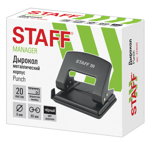 Дырокол STAFF "Manager", металлический средний, до 20 листов, черный, 224649