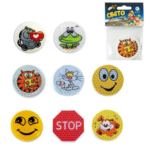 Значок СВЕТООТРАЖАЮЩИЙ пластиковый, с рисунком, 50 мм, АССОРТИ