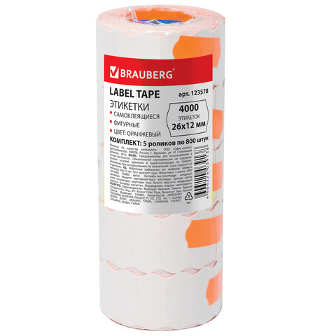 Этикет-лента 26х12 мм, волна, оранжевая, комплект 5 рулонов по 800 шт., BRAUBERG, 123578