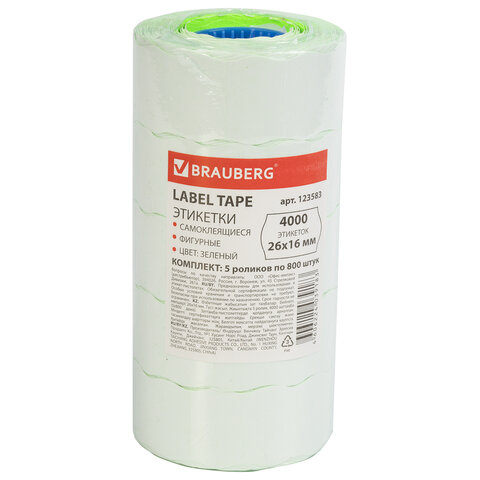 Этикет-лента 26х16 мм, волна, зеленая, комплект 5 рулонов по 800 шт., BRAUBERG, 123583