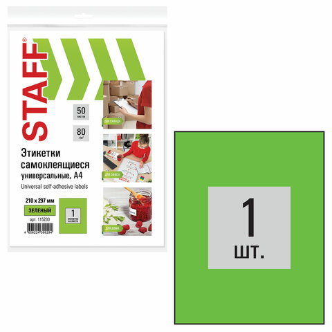 Этикетка самоклеящаяся 210х297 мм, 1 этикетка, зеленая, 80 г/м2, 50 листов, STAFF, 115230