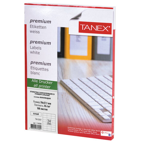 Этикетка самоклеящаяся 70х37,1 мм, 24 этикетки, белая, 70 г/м2, 100 листов, TANEX, сырье Финляндия, 114548, TW-2037