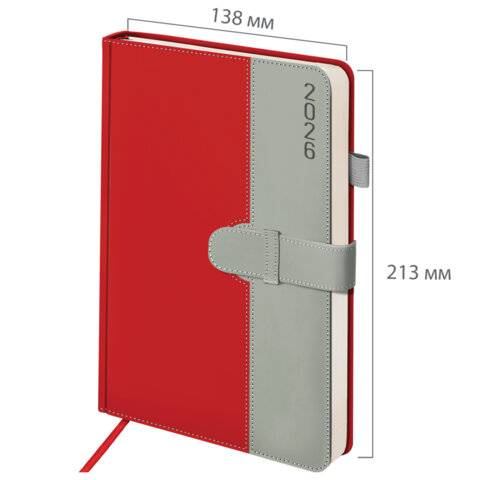 Ежедневник датированный 2026, А5, 138х213 мм, BRAUBERG "Esthetic", под кожу, держатель для ручки, застежка, красный/серый, 117371