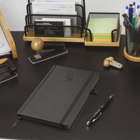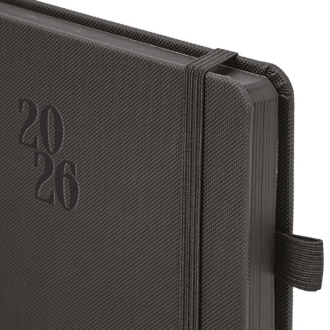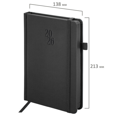 Ежедневник датированный 2026, А5, 138х213 мм, BRAUBERG "Plain", под кожу, резинка, держатель для ручки, черный, 117505
