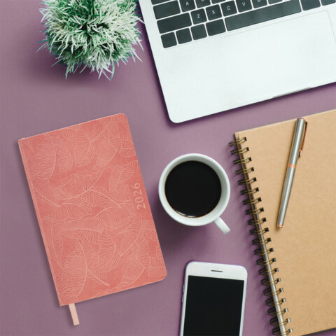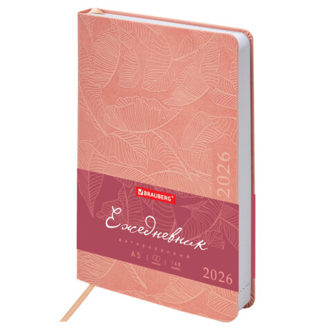 Ежедневник датированный 2026 А5 138x213 мм, BRAUBERG "Foliage", под кожу, гибкий, розовый, 117129