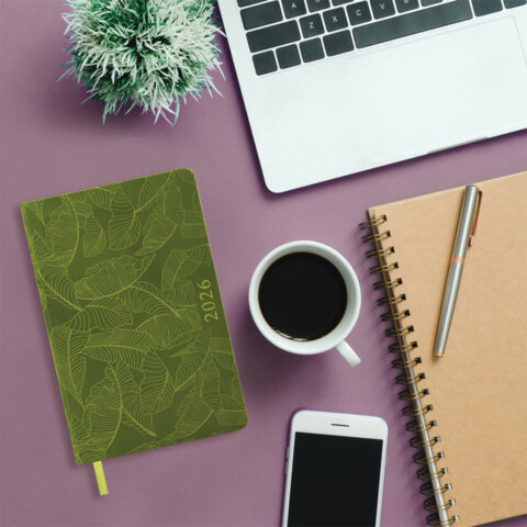 Ежедневник датированный 2026 А5 138x213 мм, BRAUBERG "Foliage", под кожу, гибкий, зеленый, 117128