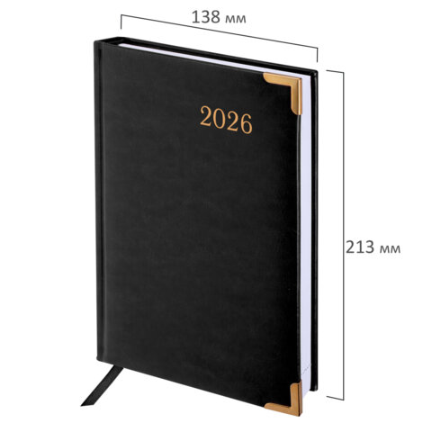 Ежедневник датированный 2026, А5, 138x213 мм, BRAUBERG "Senator", под кожу, черный, 117094