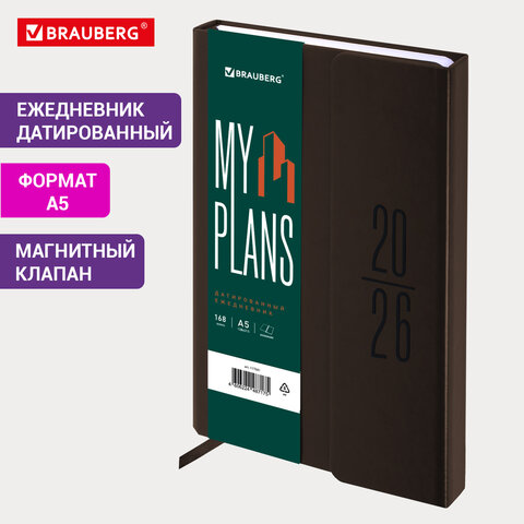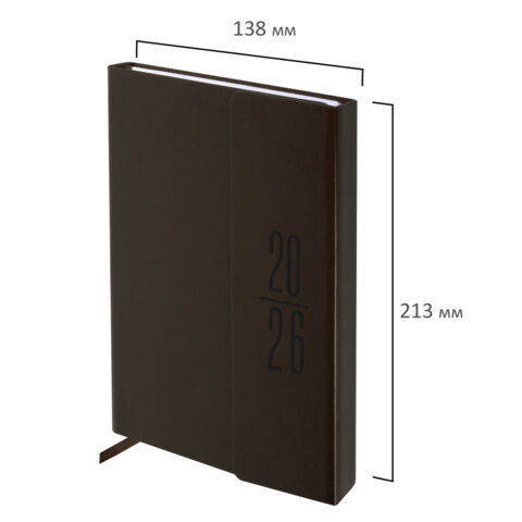 Ежедневник датированный 2026, А5, 138x213 мм, BRAUBERG "Towny", под кожу, клапан, коричневый, 117041
