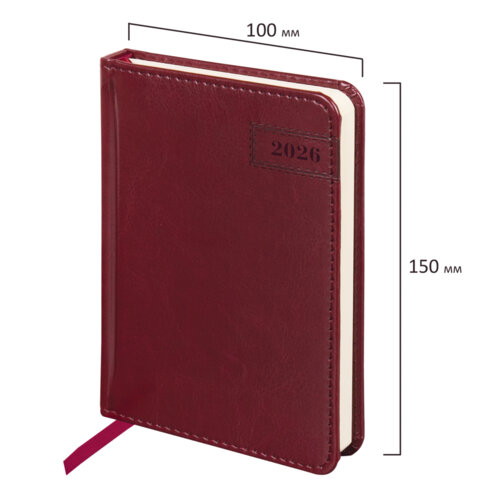 Ежедневник датированный 2026, МАЛЫЙ ФОРМАТ 100х150 мм, А6, BRAUBERG "Imperial", под кожу, бордо, 117254