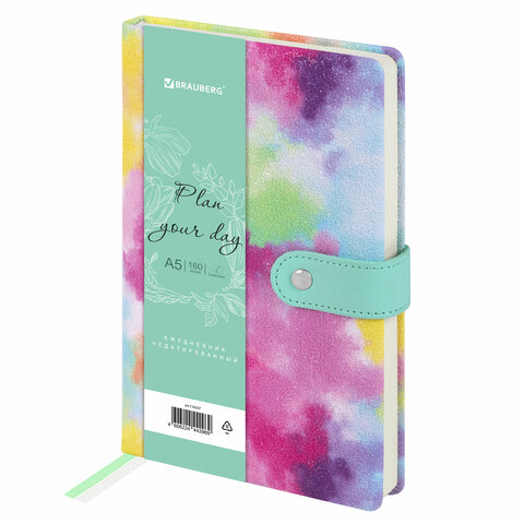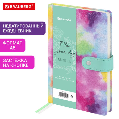 Недатированный ежедневник BRAUBERG в твёрдой обложке с эффектом каменной крошки и застёжкой — яркое, стильное и компактное решение для эффективного планирования и создания имиджа пунктуального человека.