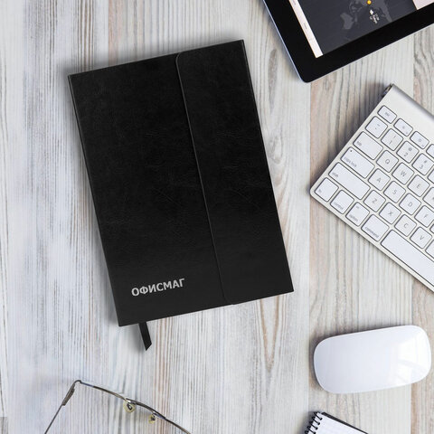 Ежедневник недатированный А5 (148x218 мм), ОФИСМАГ, под кожу, магнитный клапан, 160 л., черный, 115082