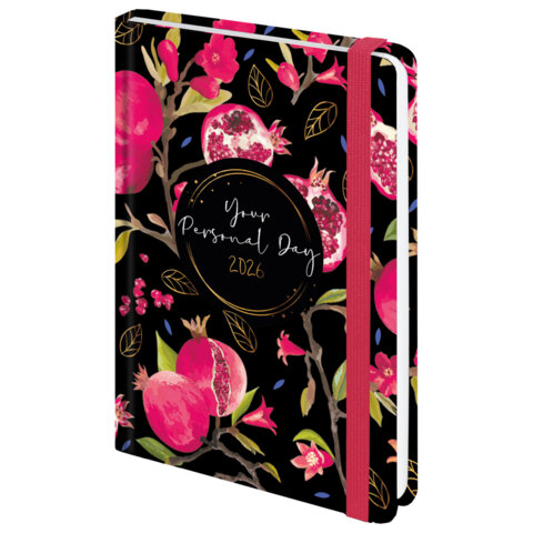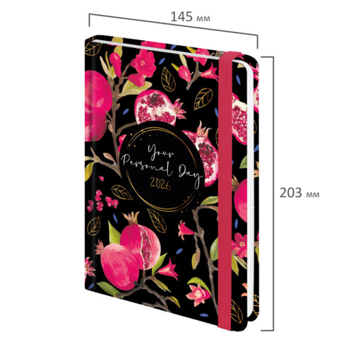 Ежедневник датированный 2026 с резинкой 145х203 мм, А5, BRAUBERG, твердый, фольга, "Гранаты", 117333