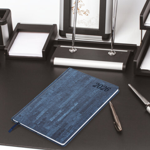 Еженедельник датированный 2026 БОЛЬШОЙ ФОРМАТ 210х297 мм, А4 BRAUBERG "Wood", под кожу, синий, 117158