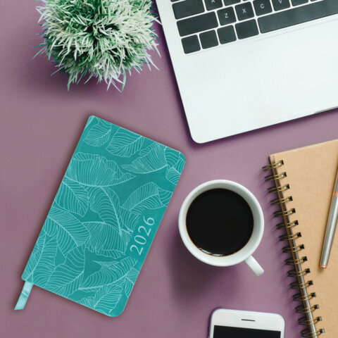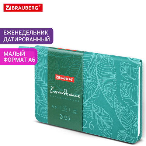 Еженедельник датированный 2026 МАЛЫЙ ФОРМАТ 95х155 мм, А6, BRAUBERG "Foliage", под кожу, бирюза, 117197