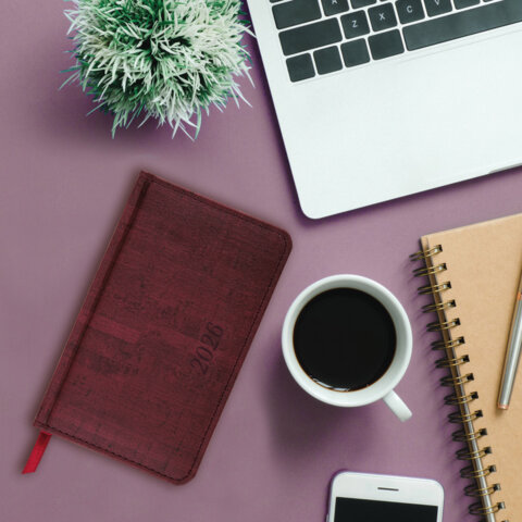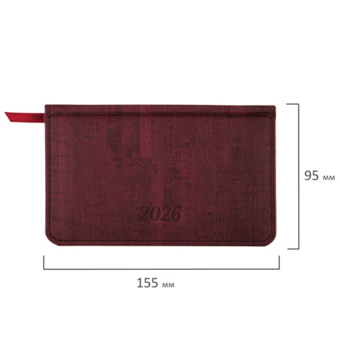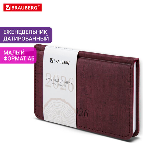 Еженедельник датированный 2026 МАЛЫЙ ФОРМАТ 95х155 мм, А6, BRAUBERG "Wood", под кожу, бордо, 117196