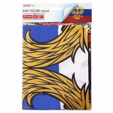 Флаг России 90х135 см с гербом, ПРОЧНЫЙ с влагозащитной пропиткой, полиэфирный шелк, STAFF, 550226