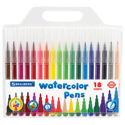 Набор фломастеров BRAUBERG "PREMIUM" с насыщенными, яркими цветами в количестве 18 штук. Чернила на водной основе практически не имеют запаха, не токсичны и легко смываются с большинства материалов и тканей.