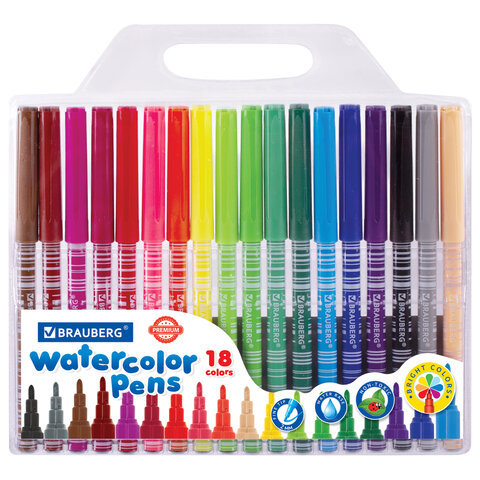 Набор фломастеров BRAUBERG "PREMIUM" с насыщенными, яркими цветами в количестве 18 штук. Чернила на водной основе практически не имеют запаха, не токсичны и легко смываются с большинства материалов и тканей.