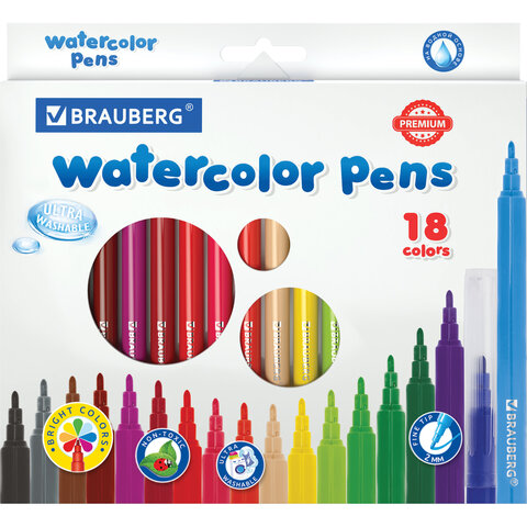 Набор ультрасмываемых BRAUBERG "PREMIUM" с насыщенными, яркими цветами в количестве 18 штук. Чернила на водной основе практически не имеют запаха, не токсичны и легко смываются с большинства материалов и тканей.