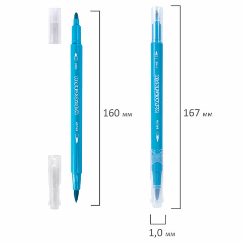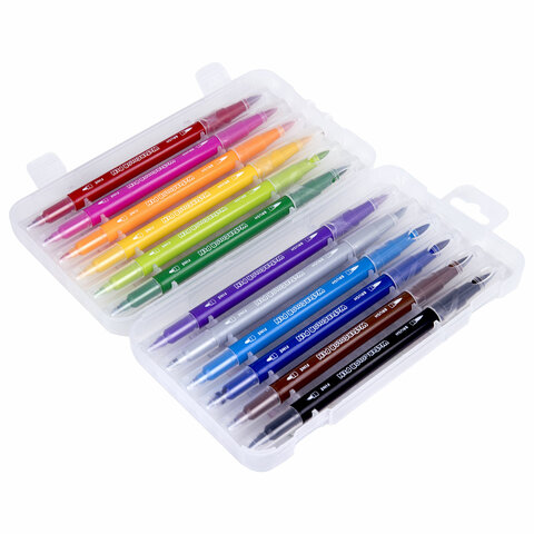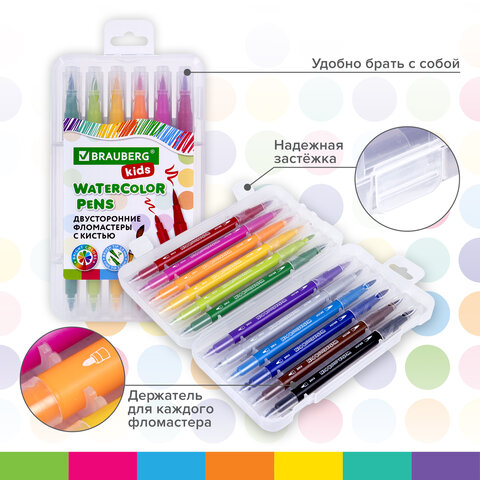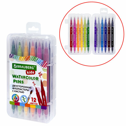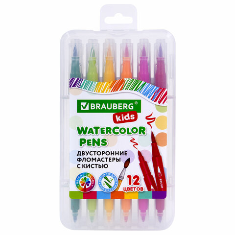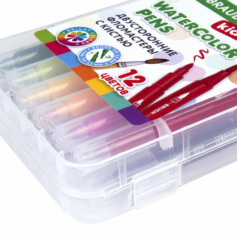 Фломастеры двусторонние с кистью 12 цветов (кисть/классический), СУПЕРКЕЙС, BRAUBERG KIDS, 152188