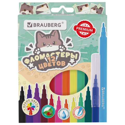 Набор фломастеров BRAUBERG "МИЛЫЕ КОТЫ" с насыщенными, яркими цветами в количестве 12 штук. Чернила на водной основе практически не имеют запаха, не токсичны и легко смываются с большинства материалов и тканей.