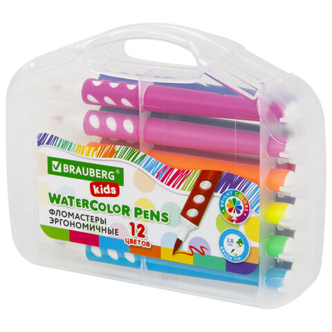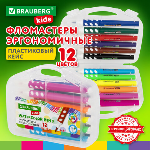 Фломастеры в суперкейсе эргономичные 12 цветов, наконечник-кисть, вентилируемый колпачок, BRAUBERG KIDS, 152184
