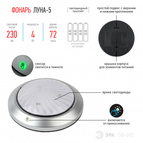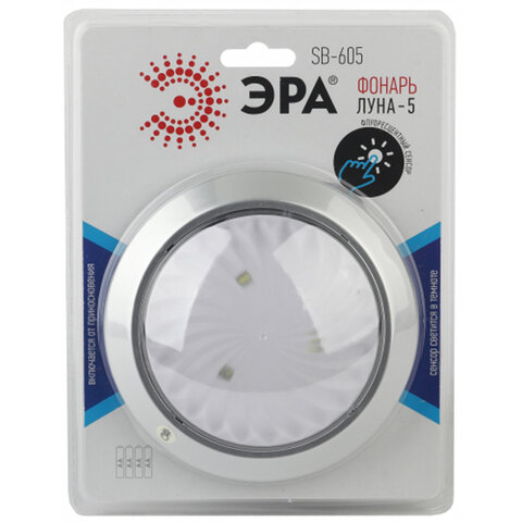 Светодиодный самоклеящийся фонарь-подсветка Эра SB-605 "Луна-5". Это прекрасное решение для местного освещения. Фонарь-подсветка подойдёт для аварийного освещения, может использоваться на даче, в машине или дома.