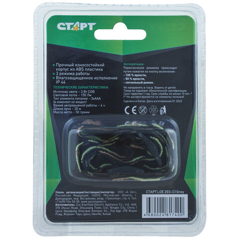 Модель LOE 203-C1 от компании СТАРТ относится к разновидности налобных фонарей – удобно надевается на голову при помощи мягкого и широкого резинового ремешка. Яркая LED-лампа позволяет освещать путь на расстоянии 20 метров.