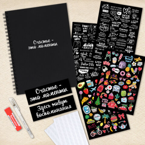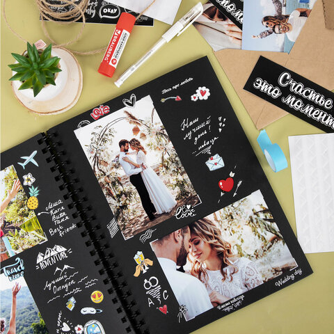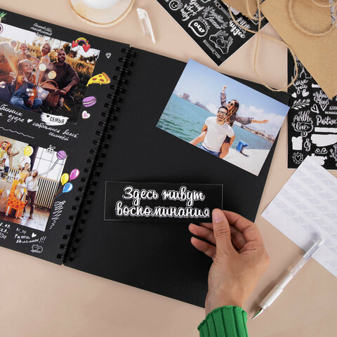 Фотоальбом 22х30 см, 24 черных листа, уголки, стикеры, ручка, клей, BRAUBERG Black Line, 880653